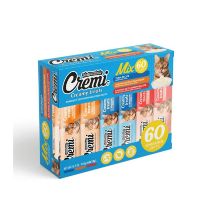Receta de Atún: Carne de atún, almidón de tapioca, aceite de pollo, taurina, goma guar, sal, sorbato potásico, suplemento de vitamina E, extracto de té verde. Receta de Salmón con Atún: Carne de salmón, carne de atún, almidón de tapioca, aceite de pollo, taurina, goma guar, sal, sorbato potásico, suplemento de vitamina E, extracto de té verde. Receta de Salmón con Camarón: Carne de salmón, carne de camarón, almidón de tapioca, aceite de pollo, taurina, goma guar, sal, sorbato potásico, suplemento de vitamina E, extracto de té verde.Cremi Naturalistic Mix Pollo