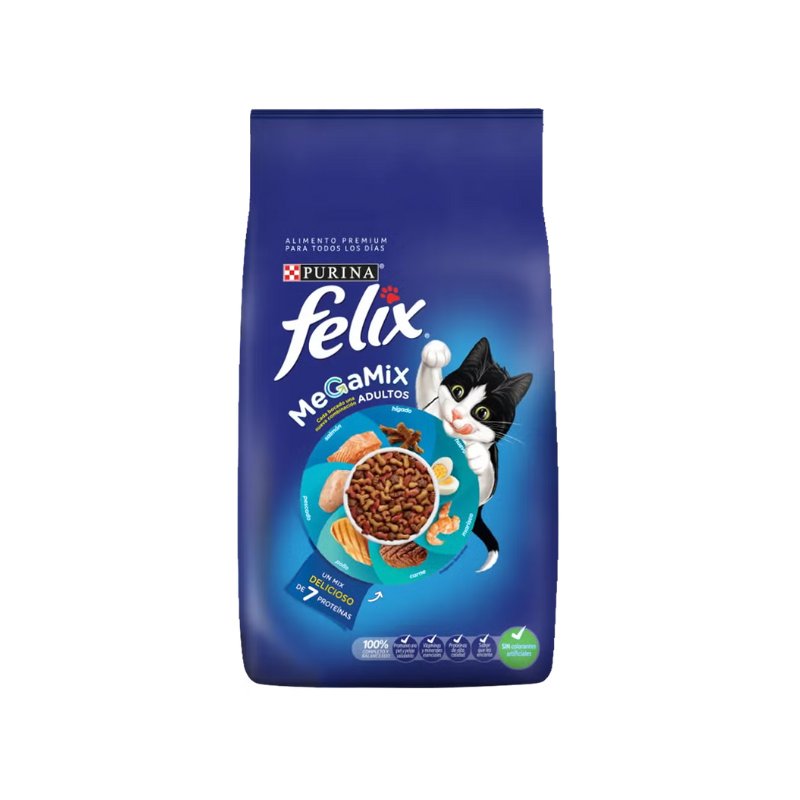 PURINA FELIX Megamix Adultos es un alimento seco completo y balanceado para gatos de todos los tamaños. FELIX ha creado un mix delicioso de 7 proteínas que a tu gato le encantará, teniendo en cada bocado una nueva combinación. Este alimento no solo es delicioso, sino que promueve una piel y pelaje saludable, y contiene proteínas de alta calidad y vitaminas y minerales esenciales. ¡Tu gato se la ingeniará para tener un megamix de sabores todos los días